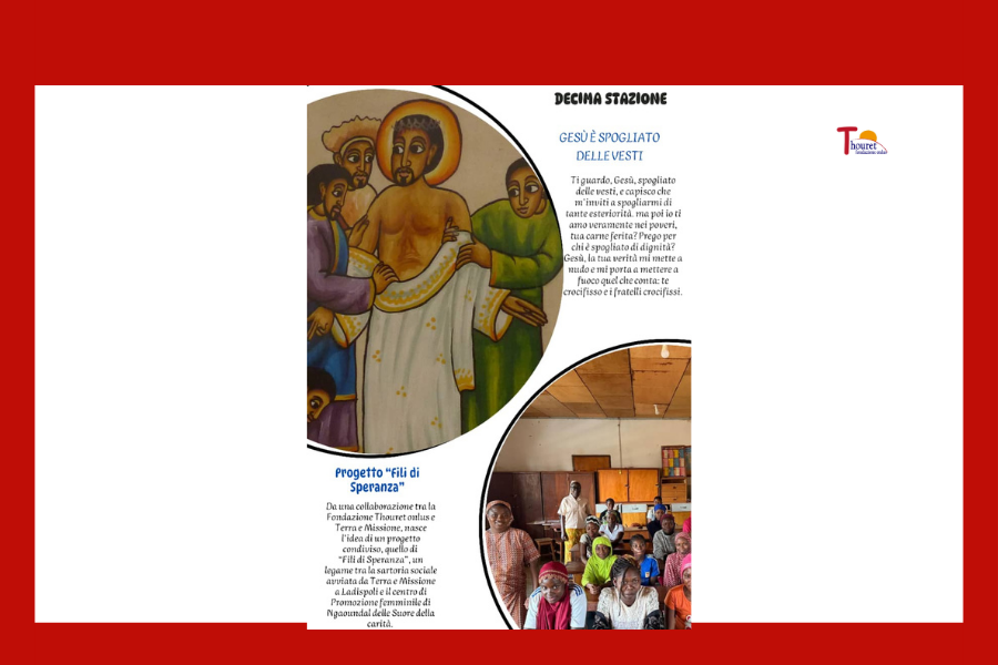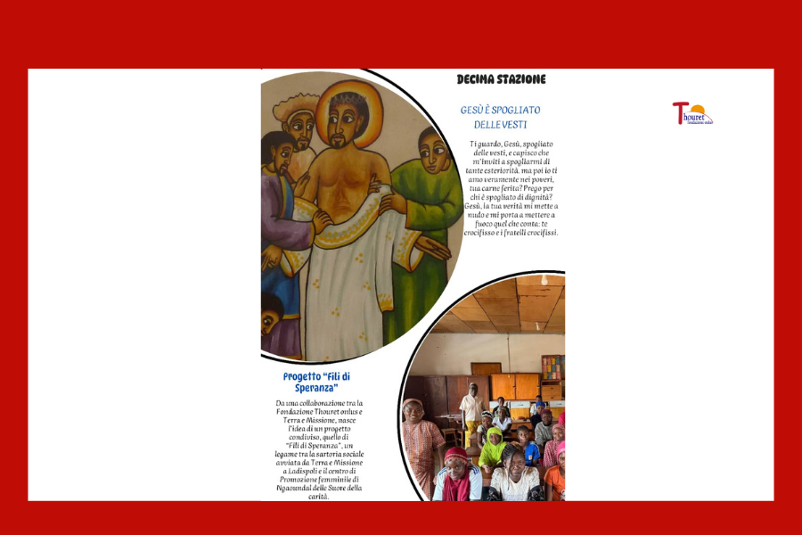 Progetto “Fili di Speranza” Da una collaborazione tra la Fondazione Thouret onlus e Terra e Missione, nasce l’idea di un progetto condiviso, quello di “Fili di Speranza”, un legame tra la sartoria sociale avviata da Terra e Missione a Ladispoli e il centro di Promozione femminile di Ngaoundal delle Suore della carità. Due mondi lontani, due modalità di lavoro molto differenti, entrambi animati da un unico sogno, quello di aiutare le donne in difficoltà a “ricucire” o a far sbocciare la propria vita, attraverso un percorso di formazione professionale e l’offerta di uno spazio di ascolto e condivisione. “Fili di Speranza” sembra davvero un titolo che dona respiro e speranza, appunto, ad ogni donna coinvolta e impegnata nel progetto, ma anche che permette di sperare in una umanità che sappia intessere legami forti di solidarietà e di comunione, nel rispetto delle diversità. Padre Nostro…. Ave o Maria Gloria