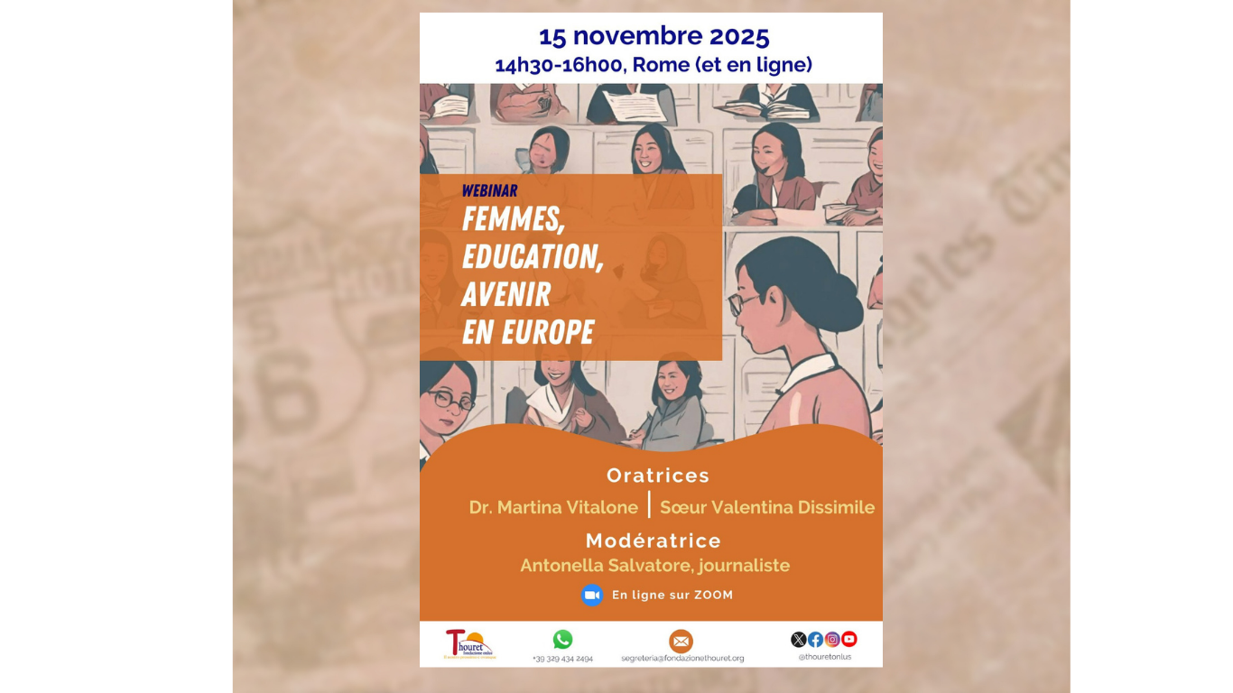 Samedi 15 novembre à 14h30 (heure de Rome) Webinaire de la Fondation Thouret pour approfondir l'importance de l'éducation, en particulier pour les femmes en Europe. L'invitation est